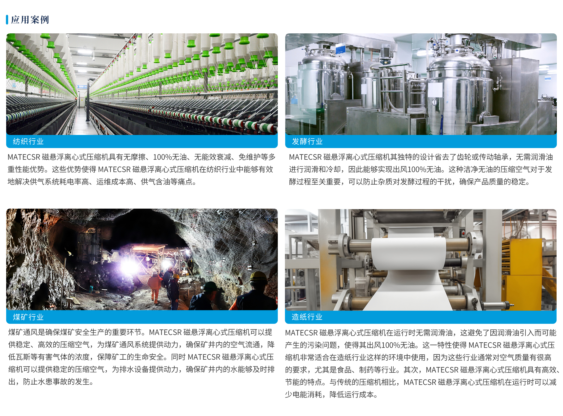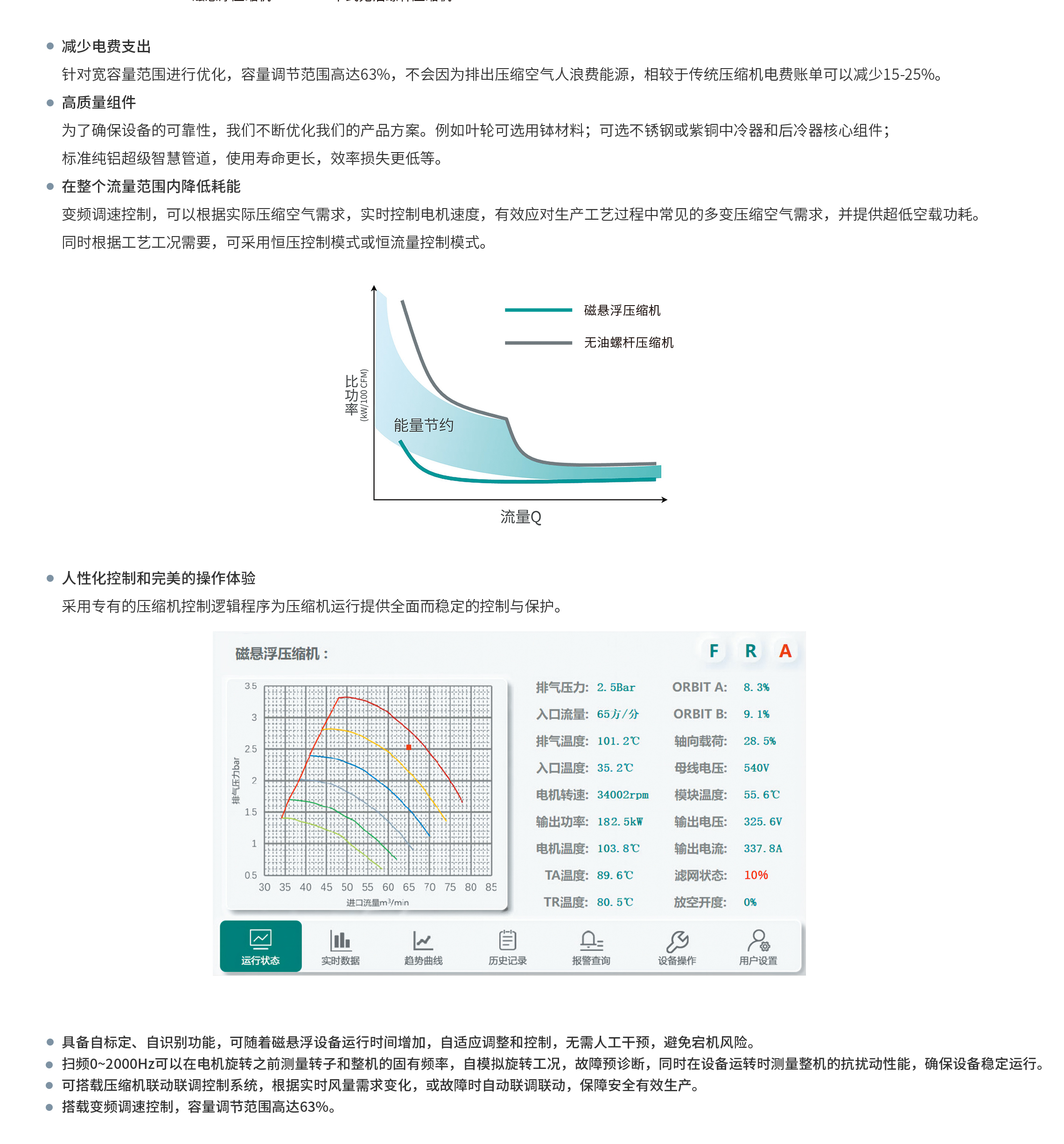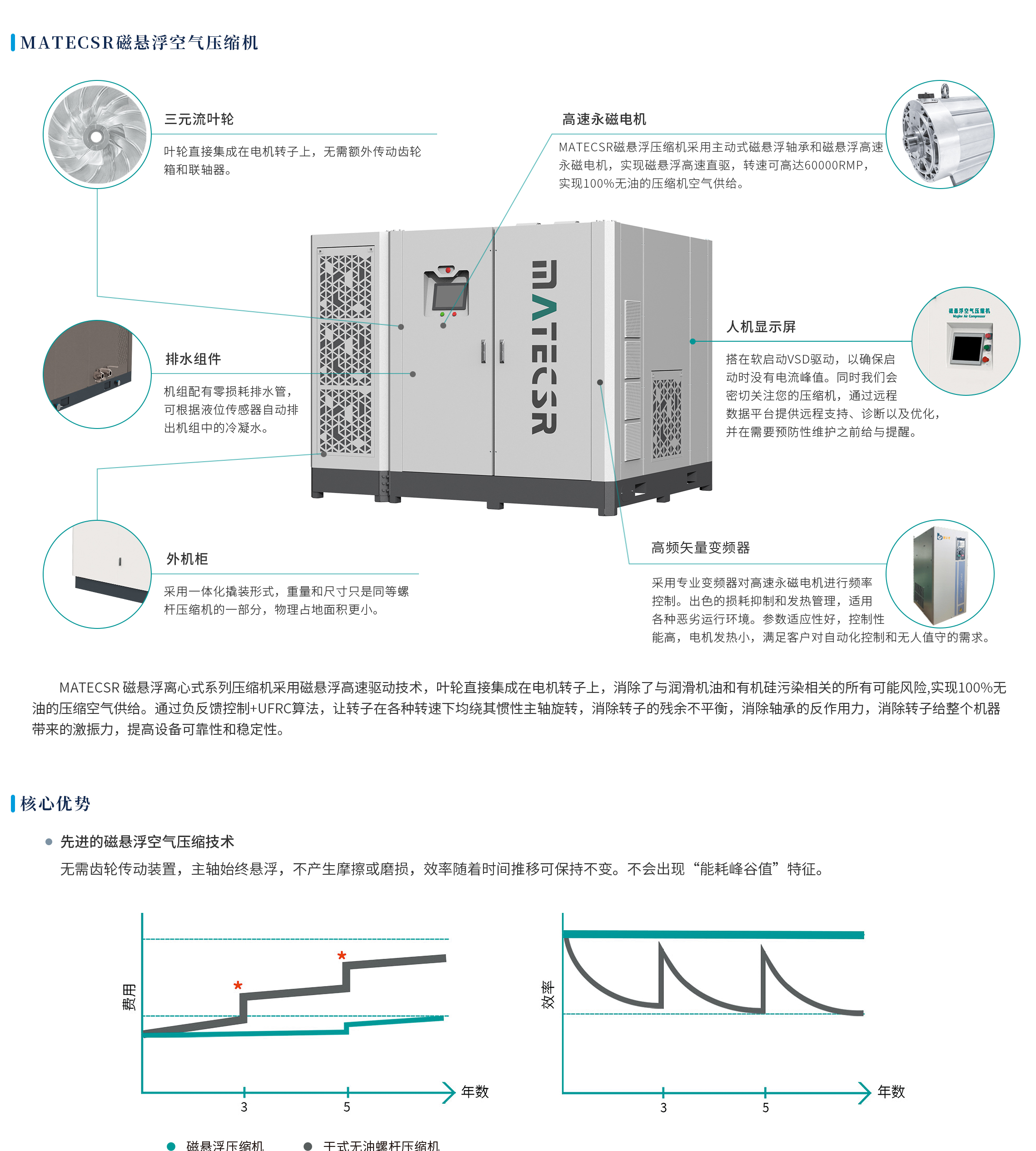 MATECSR磁悬浮离心式系列压缩机是一种利用磁悬浮技术实现无接触运转的新型压缩机。采用磁悬浮高速驱动技术,叶轮直接集成在电机转子上,消除了与润滑机油和有机硅污染相关的所有可能风险,实现100%无油的压缩空气供给。它是在传统压缩机的基础上进行改进和创新的产物,具有许多优点和应用前景。