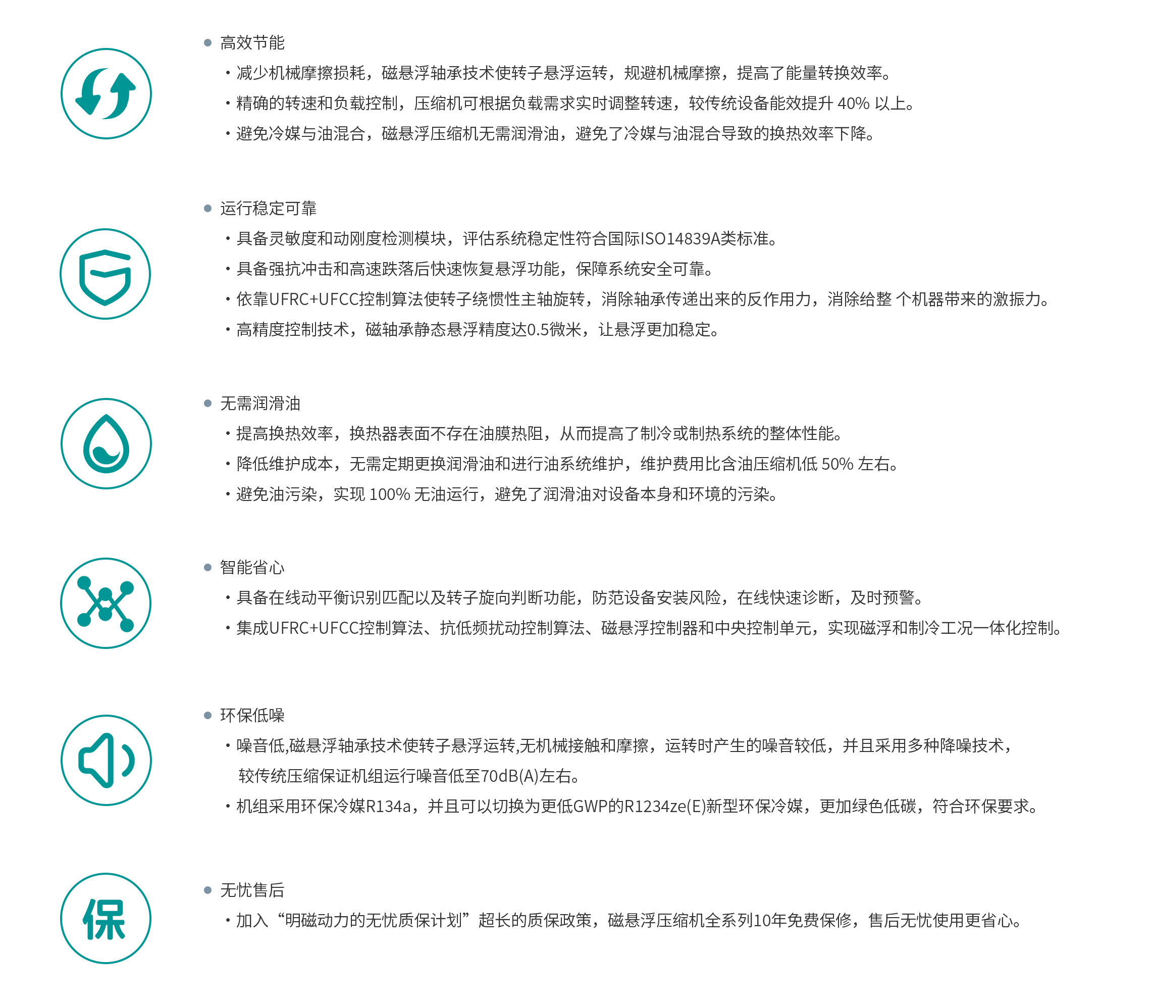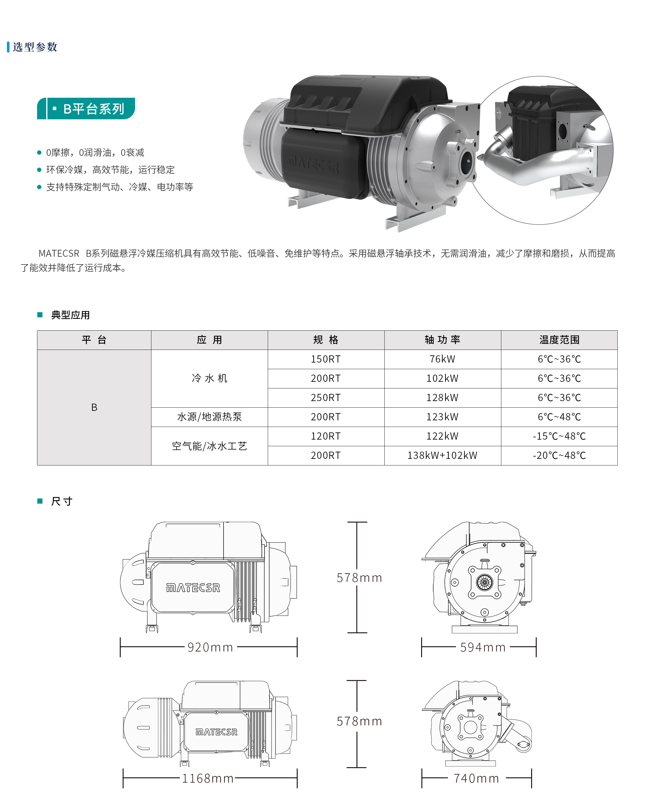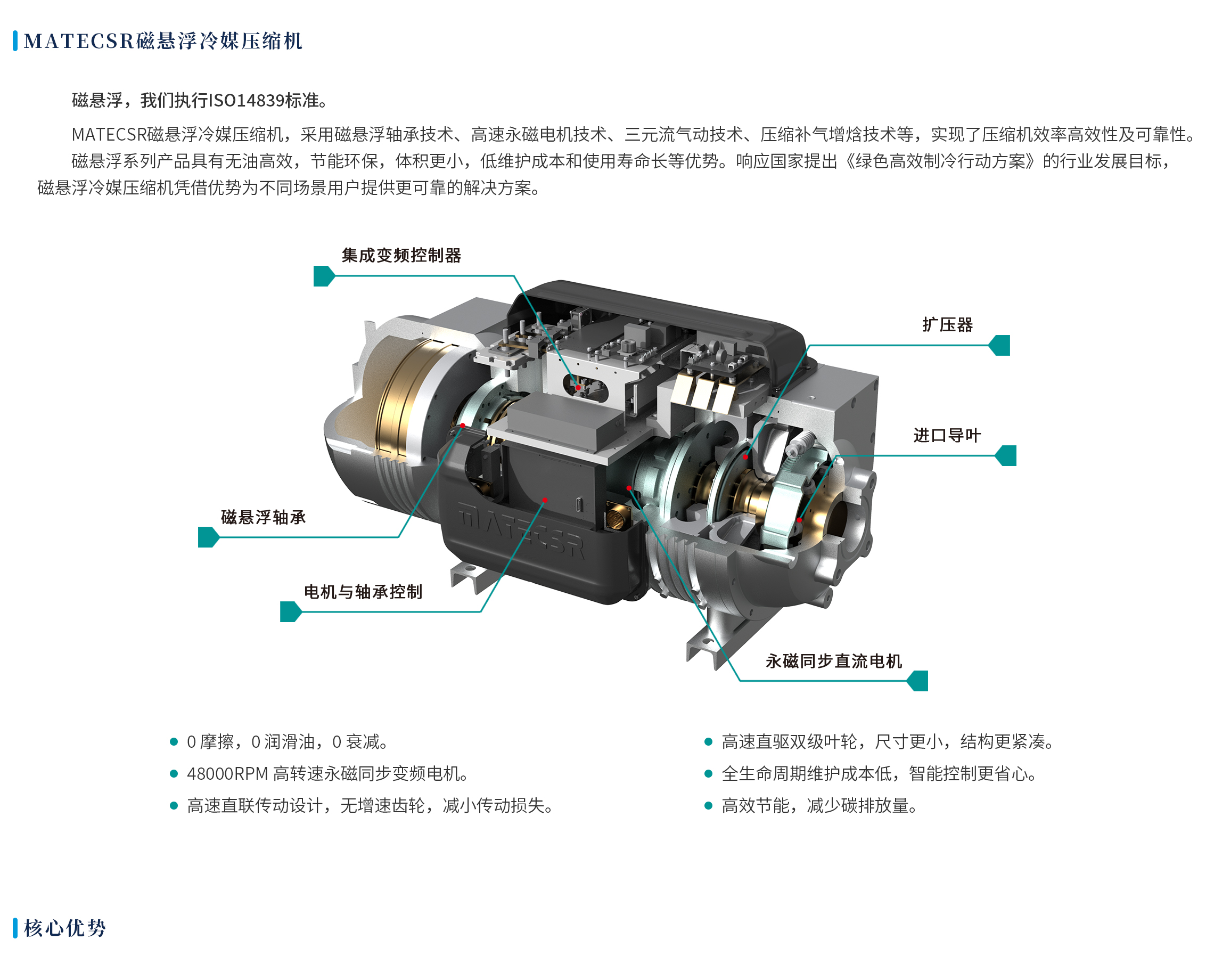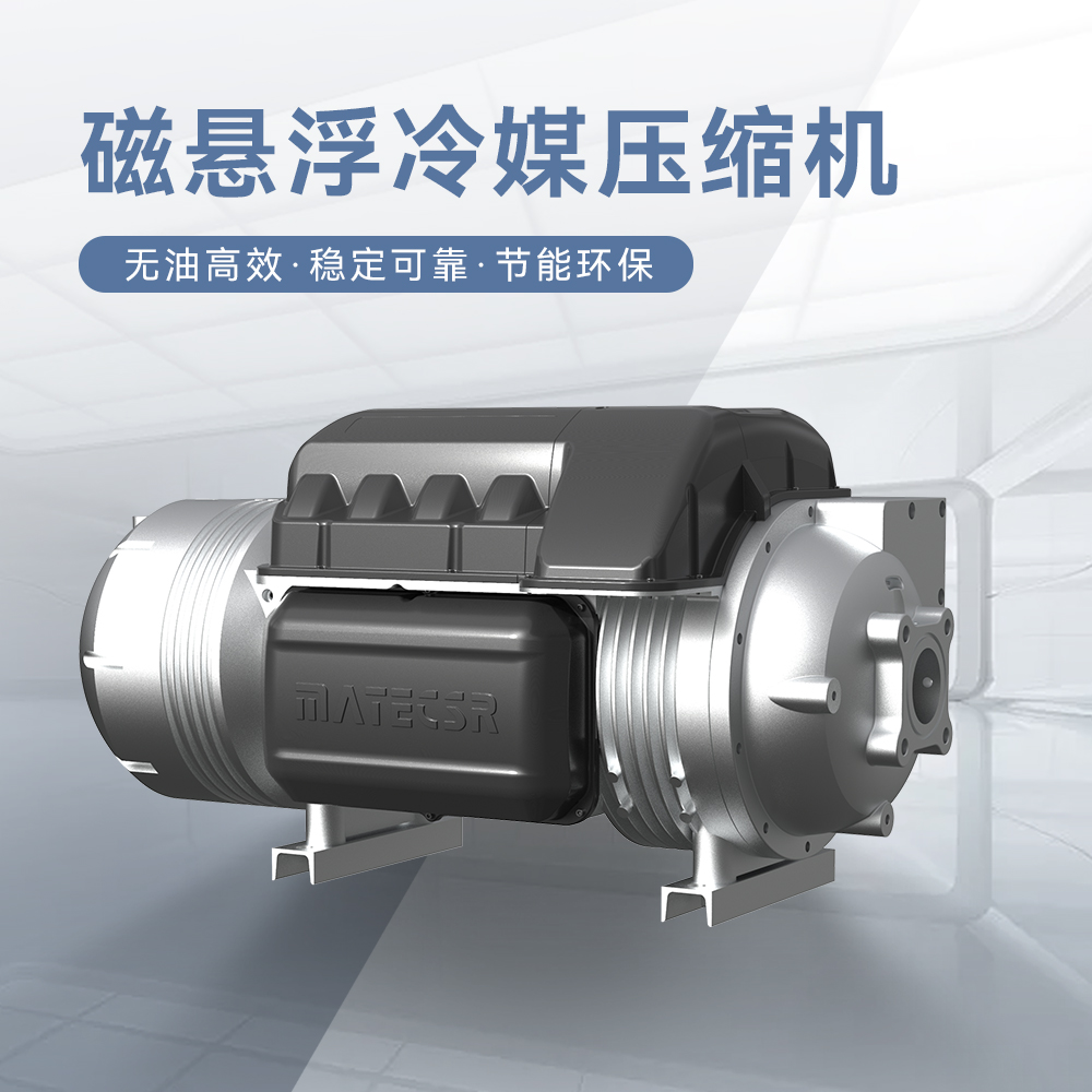 明磁动力MATECSR B平台系列磁悬浮冷媒压缩机具有高效节能、低噪音、免维护等特点。 采用磁悬浮轴承技术,无需润滑油,减少了摩擦和磨损,从而提高了能效并降低了运行成本。